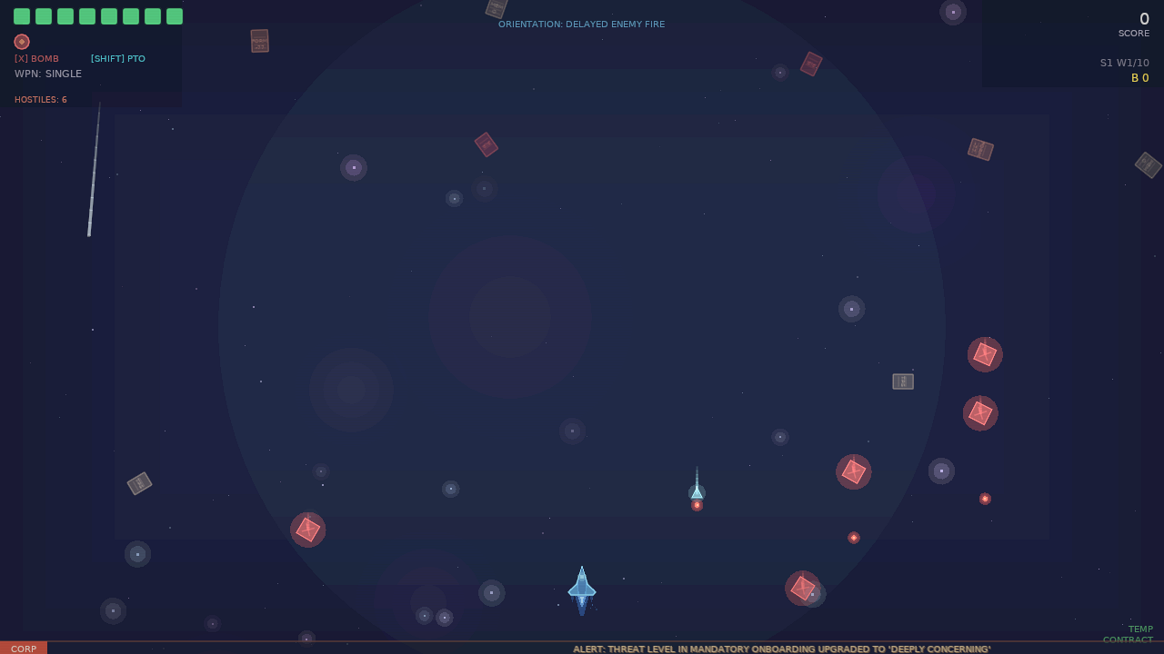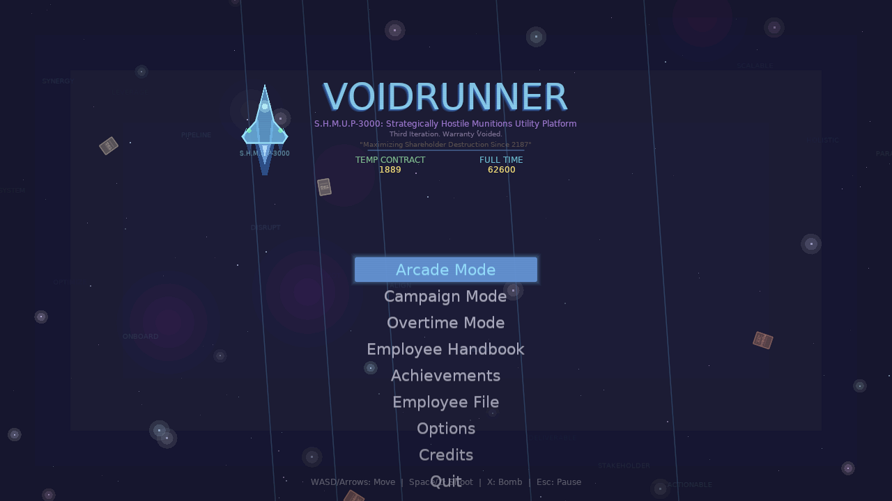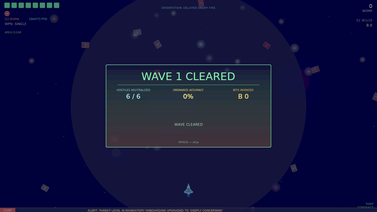 ARCADE MODE — Pure wave survival. Fast restarts, score attack, no story. For people who don't read the memos.